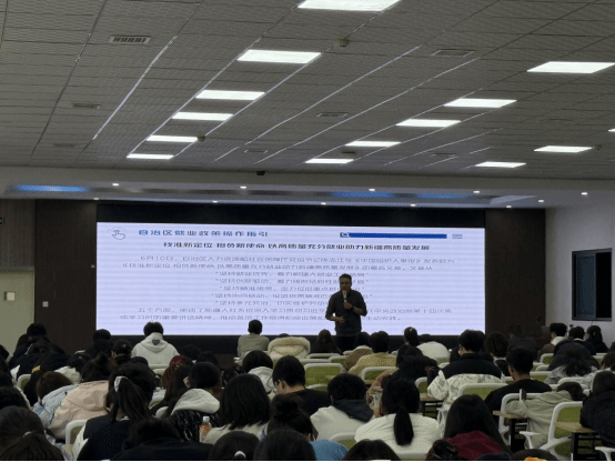 为深入贯彻落实党的二十大关于促进高质量充分就业的战略部署,精准对接新疆地区就业创业政策红利,助力毕业生明晰职业路径、增强就业竞争力,2025年11月12日17:00,旅游学院和医学院于高台校区1号综合楼7楼报告厅联合开展“‘就’‘在金秋‘职’达未来”毕业生系列活动之就业创业政策宣讲会。主讲人王志炜以政策解读与实践指导相结合的方式,为在场学子带来了一场兼具理论高度与实操价值的宣讲盛宴。