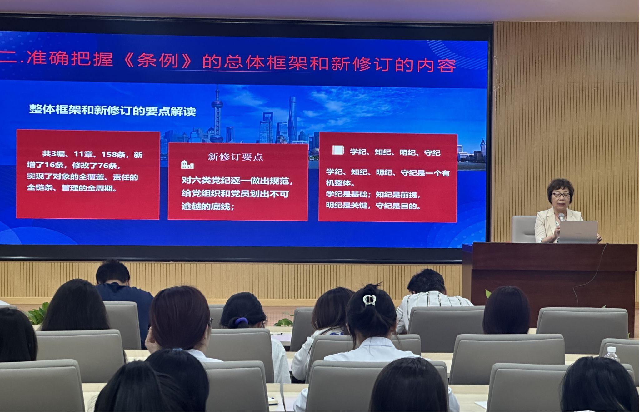 其次,通过对整体框架和新修订要点的解读,使大家准确把握《条例》的总体框架和新修订的内容,并且,结合教师党员的实际工作内容和学生党员的日常学习生活进行指导。同时强调“党员干部在纪律目前没有级别资历之分”,对即将毕业的学生进行了警示教育和殷切期望,希望他们无论在任何工作岗位都可以严守党的纪律,起到先锋模范作用!