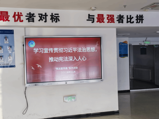 充分利用学院空间载体,构建“全方位、沉浸式”法治宣传阵地,同步开展“线上+线下”延伸宣传。在学院办公楼等区域的电子宣传屏,滚动播放2025年“宪法宣传周”主题海报、法治动漫微视频及“习近平法治思想金句”,每日更新3组内容,形成“抬头见法、指尖学法”的浓厚氛围。